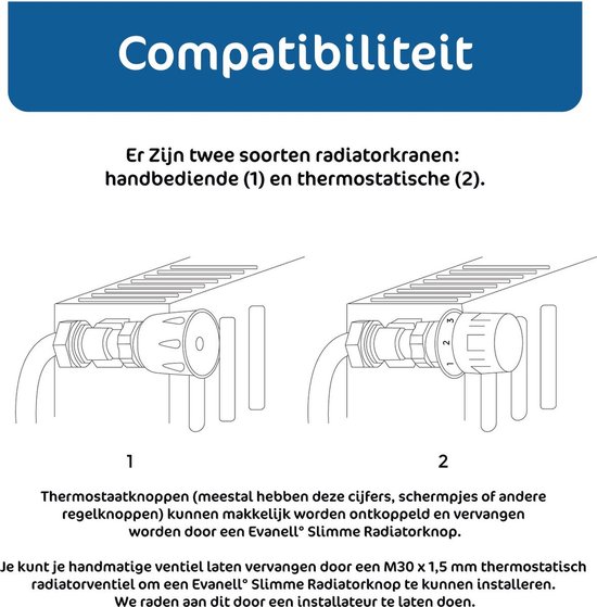 | Welke radiatorkranen zijn compatibel? | Onze smart radiatorventielen werken met standaard thermostatische radiatorkranen (EN 215) en ondersteunen Danfoss RA, RAV, RAVL en M28 met de juiste adapter. Adapters niet inbegrepen. |